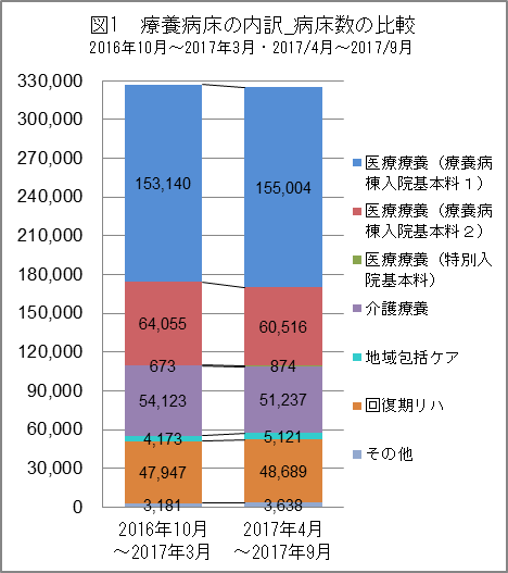 今回調査(2017年9月)の療養病床数を前回調査(2017年3月)と比較すると、半年間で介護療養は2,833床、療養病棟入院基本料2は3,539床減少した。一方、地域包括ケアや回復期リハなどは増加している。そのことを踏まえると他病棟へ転換していることがわかる(図1・図2)。