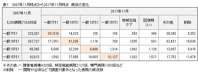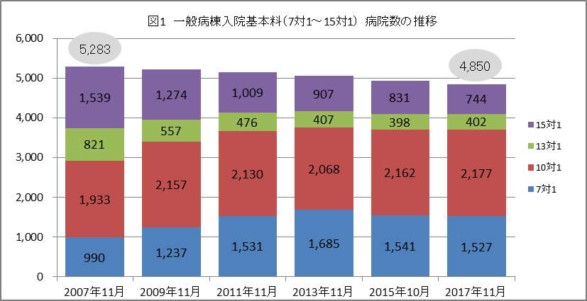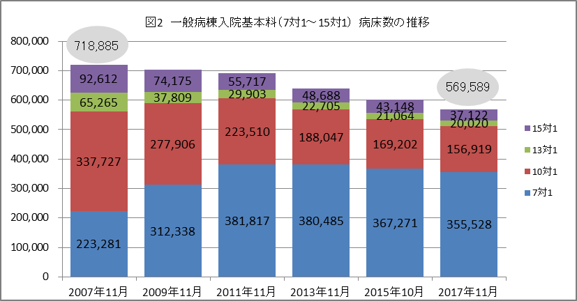2017 年11 月時点で特定機能病院等を除く一般7 対1 から一般15 対1 を算定していた病院の合計は、4,850 病院569,589 床であった。5,283 病院718,885 床であった10 年前の2007 年11 月時点と比較すると、433病院149,296 床減少した。大きな変化があった項目を見ると、一般7 対1 は2,247 床増え、一般10 対1 は180,808 床減っていた。(図1、図2)
