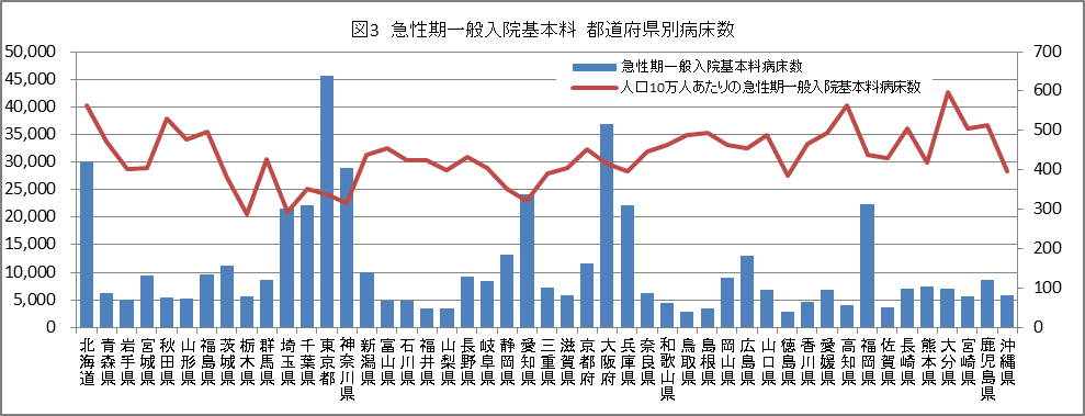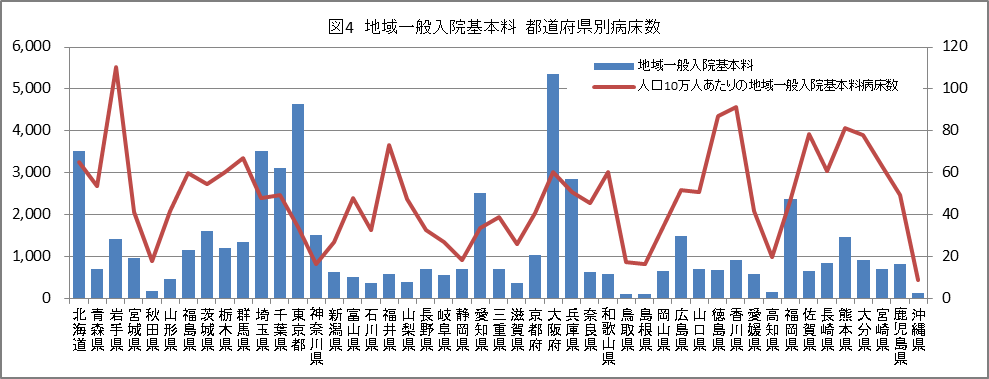 人口10 万人あたりの病床数を都道府県別に見ると、急性期一般入院基本料の全国平均は435.4 床であり、最も多い都道府県は大分595.7 床、最も少ない都道府県は栃木287.8 床であった。地域一般入院基本料の全国平均は48.1 床であり、急性期一般入院基本料と比較すると1/10 程度である。また、地域一般入院基本料の人口10 万人あたりの病床数は、急性期一般入院基本料に比べ都道府県のばらつきが大きく、最も多い岩手110.5 床と最も少ない沖縄8.9 床との間に約12 倍の差があった。(図3、図4)