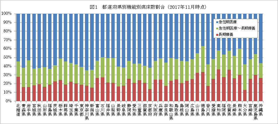 算定病床数を都道府県ごとに見ると、全国的に「急性期医療」病床の割合が高く、最も高かった県は神奈川64.5%であり、次いで、新潟64.1%、福島62.9%と続いた。全国平均は54.2%であり、最も高かった神奈川64.5%と最も低かった徳島36.9%の差は27.6 ポイントであった。(図1)