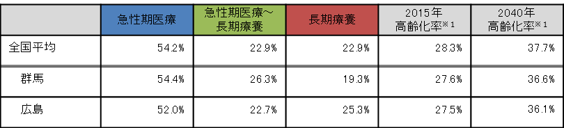 2015 年度および2040 年度の高齢化率が近い群馬と広島を比較したところ、「急性期医療」および「急性期医療~長期療養」の病床割合は群馬が高く、「長期療養」は広島が高かった。(表1)