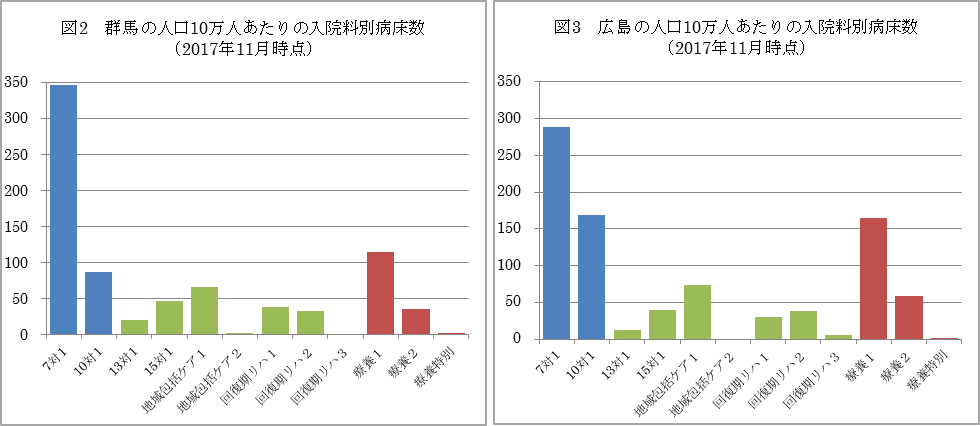 「急性期医療」「急性期医療~長期療養」「長期療養」に該当する病床数を人口10 万人あたり※2 で計算すると、全国平均は、「急性期医療」は403 床、「急性期医療~長期療養」は162 床、「長期療養」は168 床であった。群馬と広島を比較すると、群馬は病床数が多い順に、7 対1(347 床)、療養1(115 床)、10 対1(87 床)であったのに対し、広島は7 対1(288 床)、10 対1(169 床)、療養1(164 床)であった。(図2、図3)