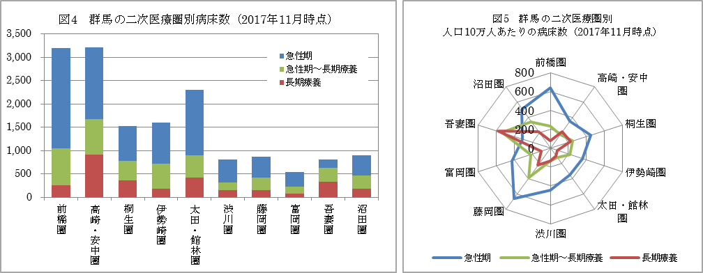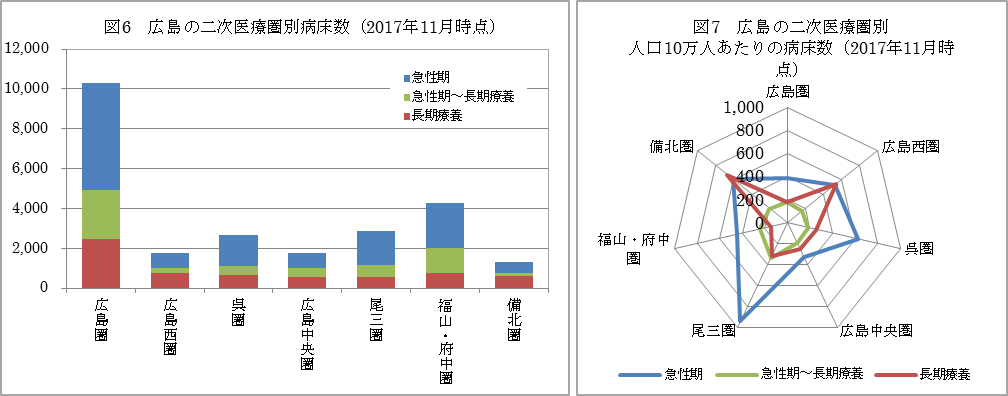 人口10 万人あたり※2 でみると、病床数は大きく偏っていた。群馬は前橋圏および藤岡圏においては「急性期医療」病床が多く、吾妻圏においては「長期療養」病床が多かった。広島は、尾三圏の「急性期医療」病床が目立って多かった。(図5、図7)