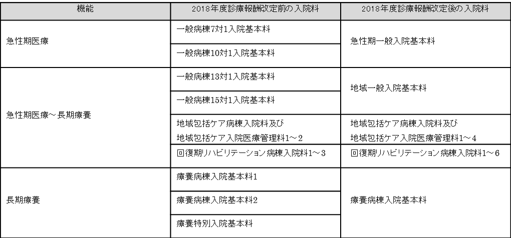 2018 年度診療報酬改定で入院料の評価体系が見直されました。見直しの対象となった主な入院料は、一般病棟入院基本料、地域包括ケア病棟入院料及び地域包括ケア入院医療管理料、回復期リハビリテーション病棟入院料、療養病棟入院基本料であり、「急性期医療」「急性期医療~長期療養」「長期療養」の3 つの機能に再編・統合されました(参考1)。