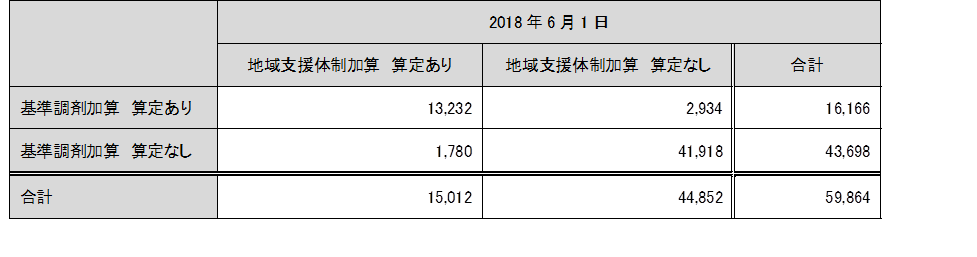 2018 年2 月1 日時点で基準調剤加算を算定していた薬局は、全国で16,166 軒(保険薬局全体の27.0%)であったのに対し、2018 年6 月1 日時点で地域支援体制加算を算定していた薬局は15,012 軒(保険薬局全体の25.1%)であった。地域支援体制加算算定薬局は、基準調剤加算より1,154 軒(1.9 ポイント)少なかった。(表2)また、2018 年2 月1 日時点で基準調剤加算を算定していた16,166 軒のうち81.9%にあたる13,232 軒が、2018 年6 月1 日時点で地域支援体制加算を算定していた。(表2)