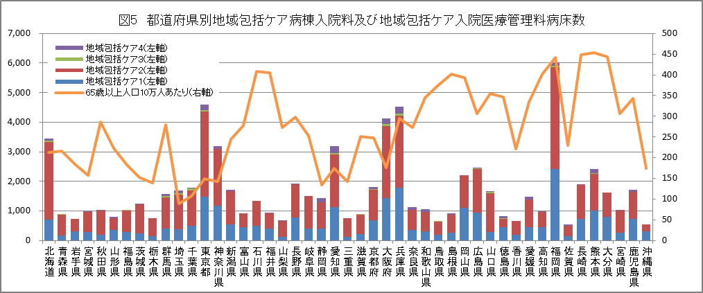 2018 年11 月時点の地域包括ケア病床を都道府県別に集計すると、福岡が最も多く6,016 床、次いで、東京4,595 床、兵庫4,525 床であった(図5、表3)。