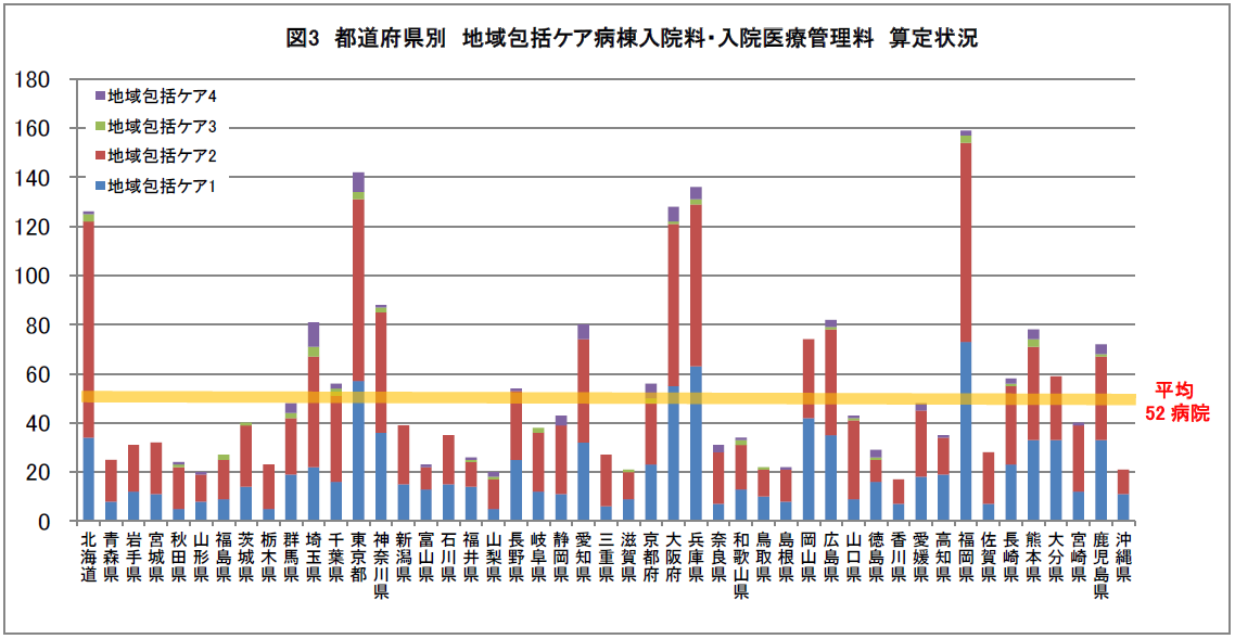 2019年6月時点で地域包括ケア病床を届出ていた2,424病院を都道府県別にみると、最も届出施設数が多かったのは福岡県で、159病院6,305床であった。次いで、東京都の142病院4,890床、兵庫県の136病院4,734床とつづいた。最も届出施設数が少なかったのは香川県の17病院784床で、山形県の20病院815床、山梨県の20病院695床とつづいた。(図3) 全国の平均届出病院数は52病院となっており、平均を上回っていたのは17都道府県であった。このうち、100病院以上の届出があったのは5都道府県で、届出病院数の多い順から、福岡県(159病院)、東京都(142病院)、兵庫県(136病院)、大阪府(128病院)、北海道(126病院)となっていた。全国平均の52病院に満たなかった30県の内訳をみると、20病院未満が1県、21~30病院が15県、31~40病院が10県、41~52病院未満が4県となっていた。
