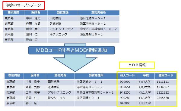 学会専門医等の情報をデータ化し、MDBコードを付与することで医師の属性情報を取り込むことが出来ます。データ化することで、貴社製品のターゲット先選定等にご活用いただけます。
